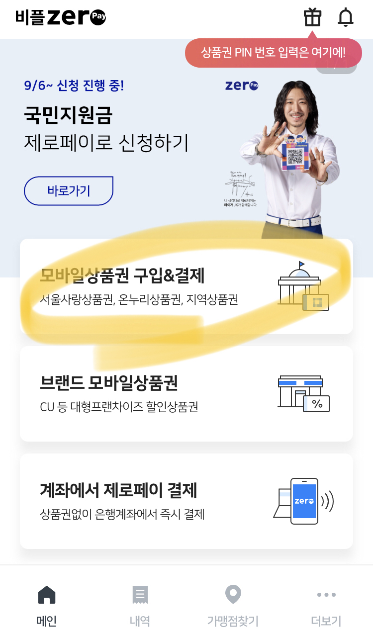 메인 화면에서 "모바일 상품권 구입&결제"를 클릭한다.