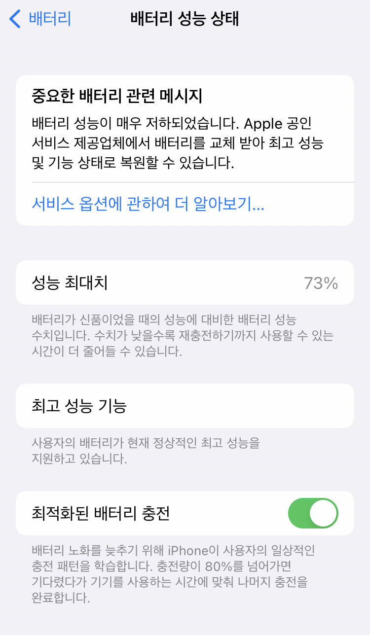 설정>베터리>베터리 성능상태>서비스 옵션에 관하여 더 알아보기를 누른다.