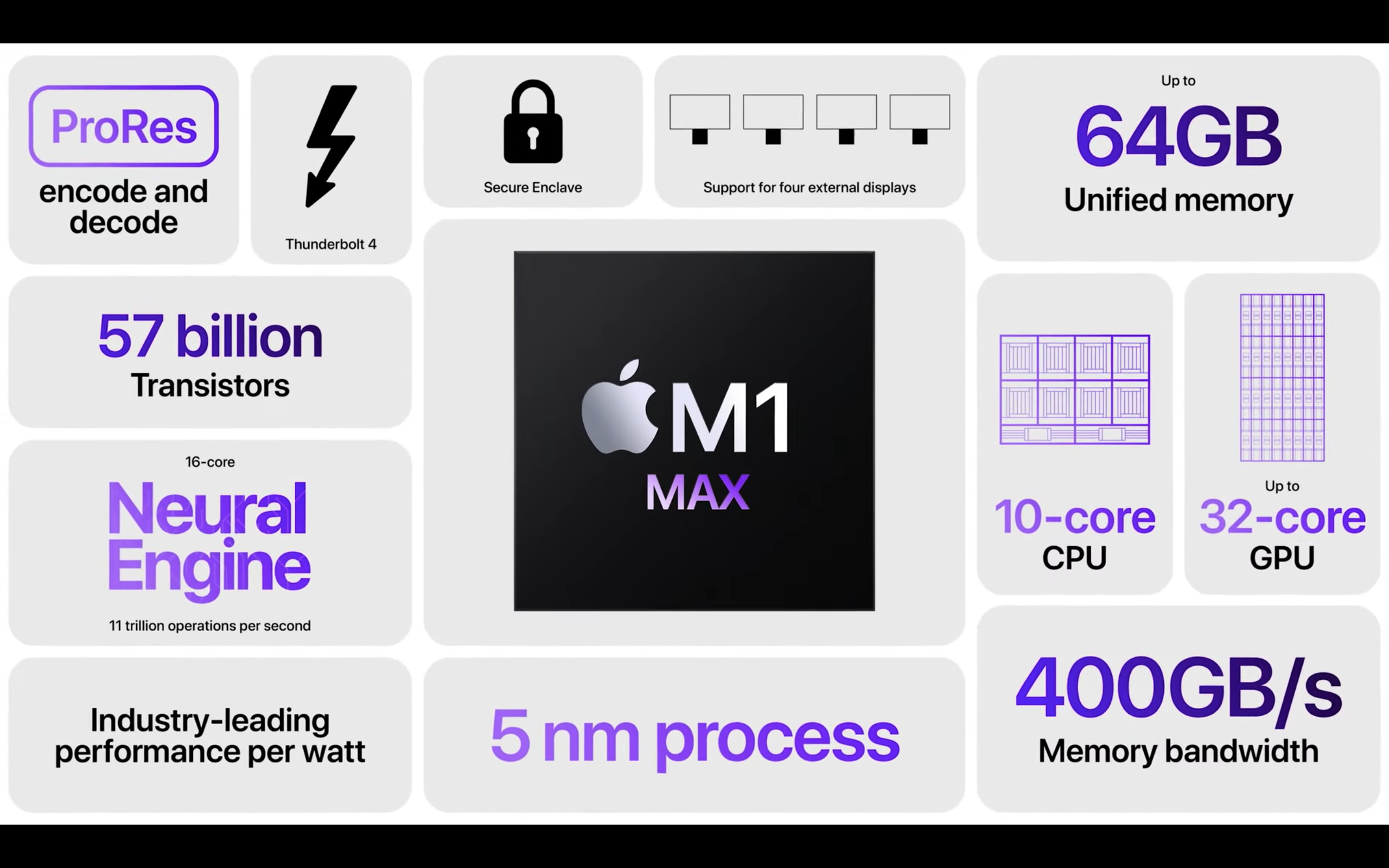 RAM: 최대 64기가램지원, M1보다 3.5배, M1Pro보다 1.7배 빨라짐